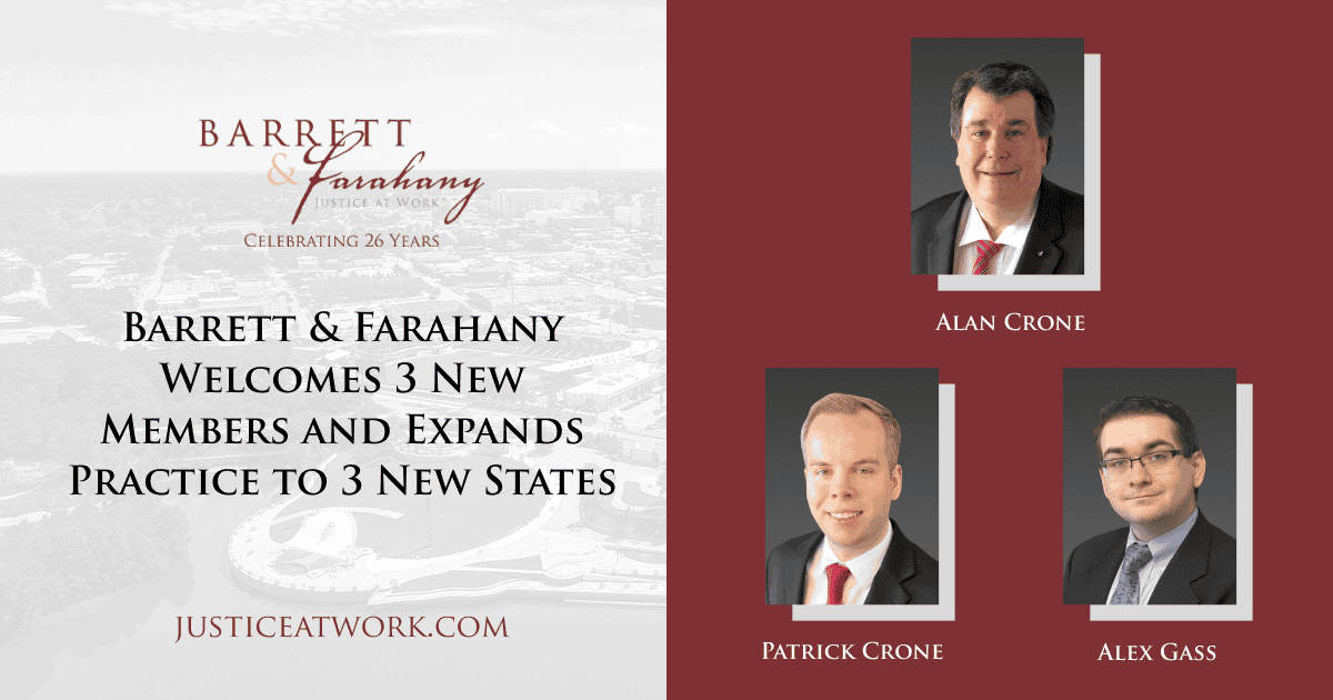 Learn more at justiceatwork.com, connect on LinkedIn at linkedin.com/company/barrettfarahany, or follow on Facebook at facebook.com/BarrettandFarahany.